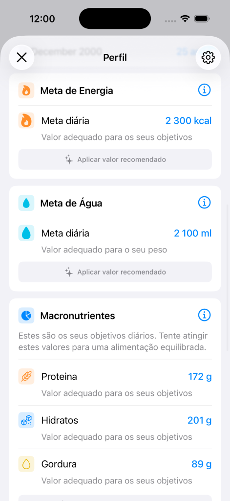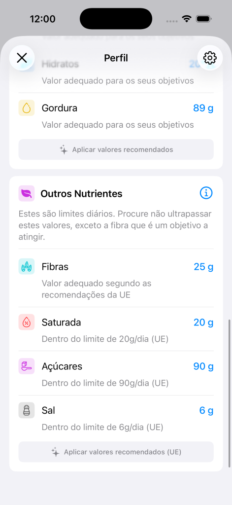 Após configurar o perfil, a app sugere valores recomendados com base em fórmulas científicas e referências europeias.