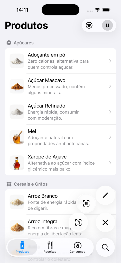 - Botões flutuantes – ações rápidas como adicionar produtos ou consumos