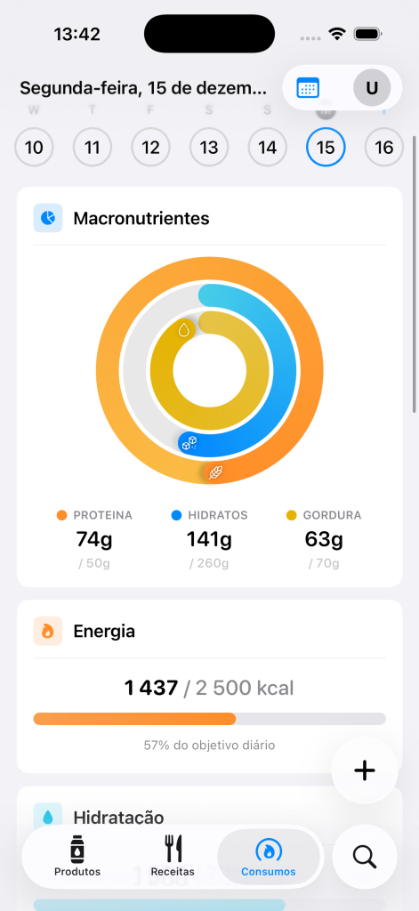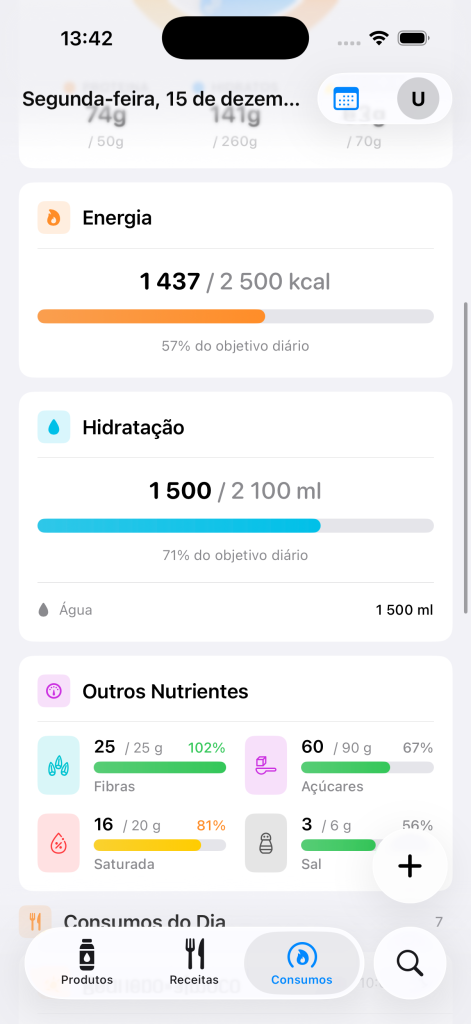 A secção Consumos é onde acompanhas a tua alimentação diária e monitorizas o teu progresso nutricional ao longo do tempo.