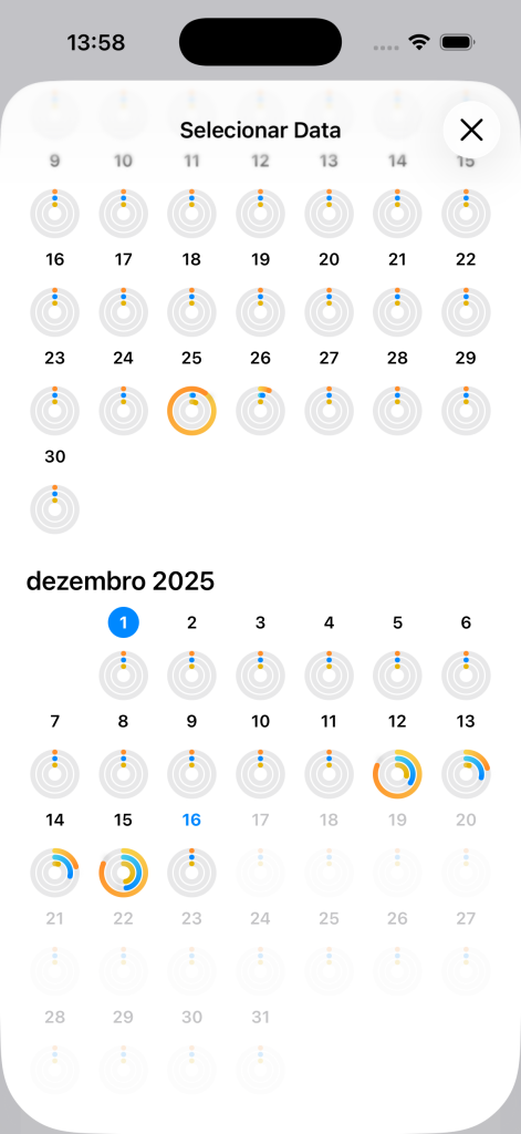 A vista de Calendário oferece uma perspetiva mais ampla do teu histórico alimentar.