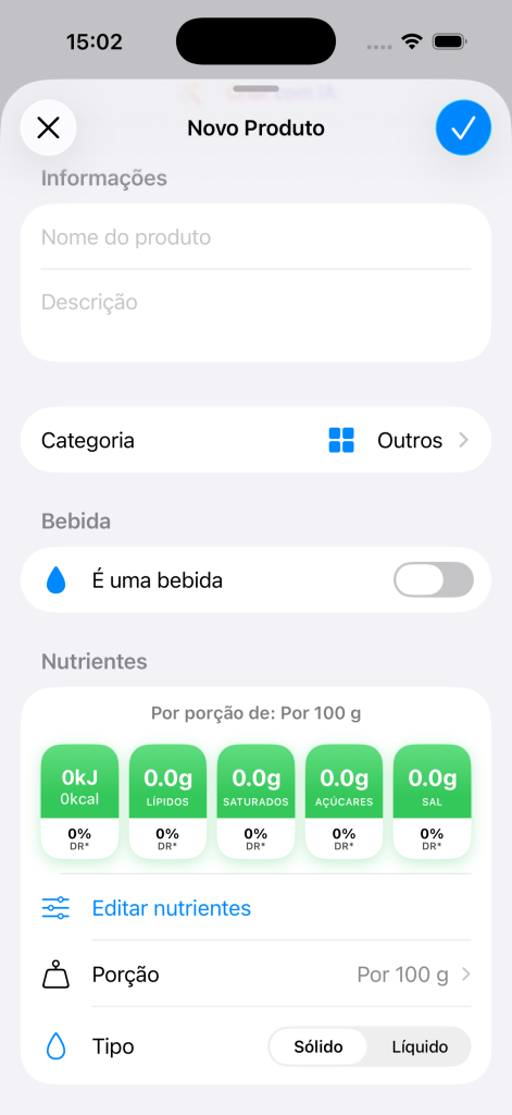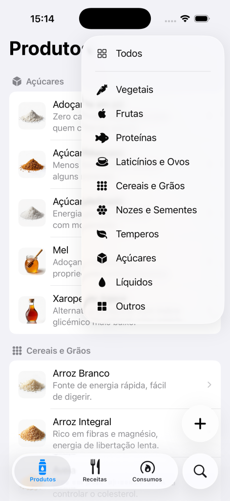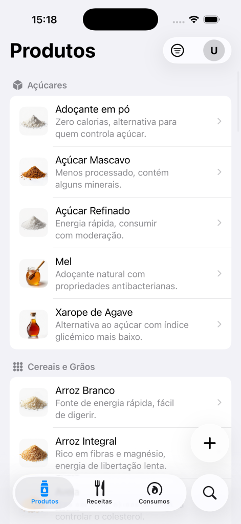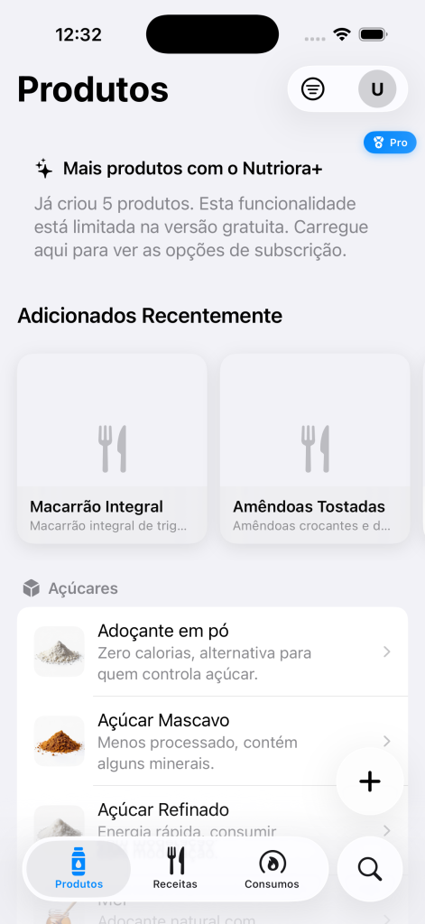 A secção Produtos do Nutriora permite adicionar, organizar e analisar alimentos e bebidas de forma simples e inteligente.