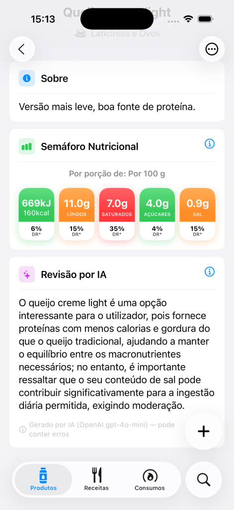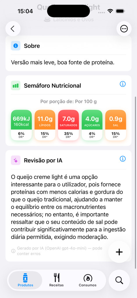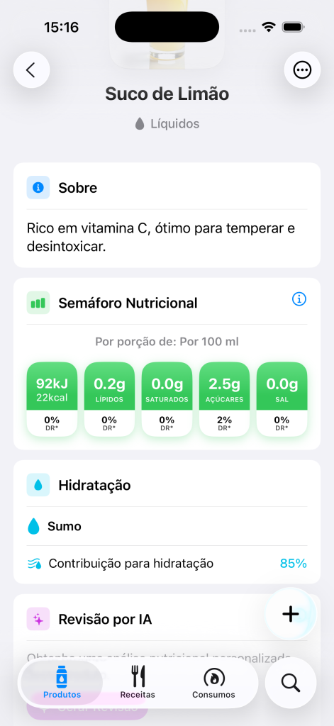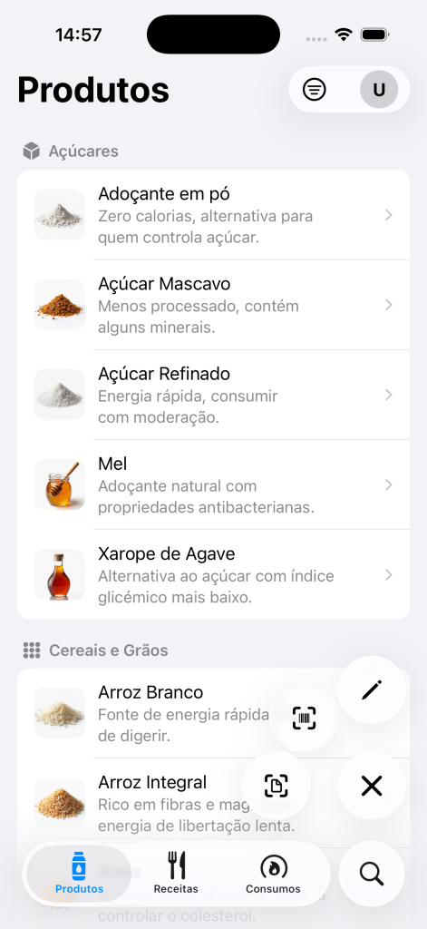 Podes criar produtos através de digitalização, leitura de código de barras ou registo manual, e depois acompanhar a sua qualidade nutricional com o semáforo nutricional e análises por IA.