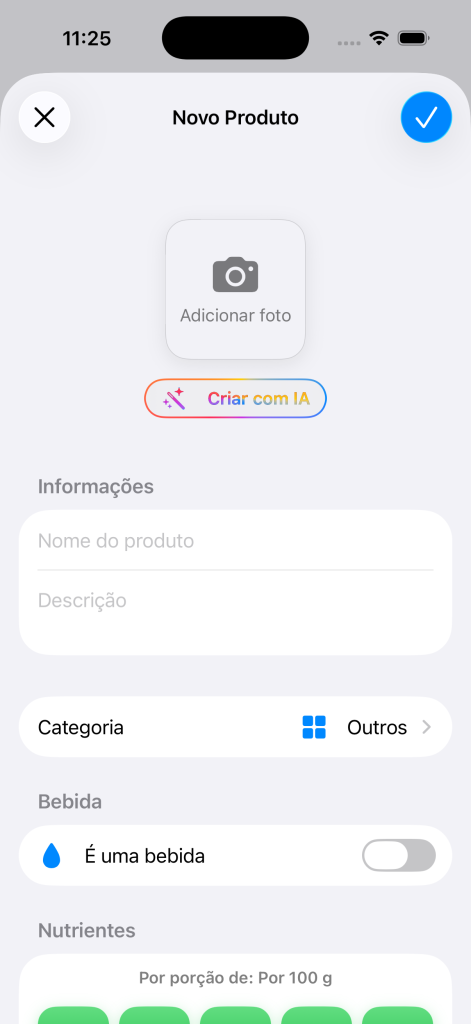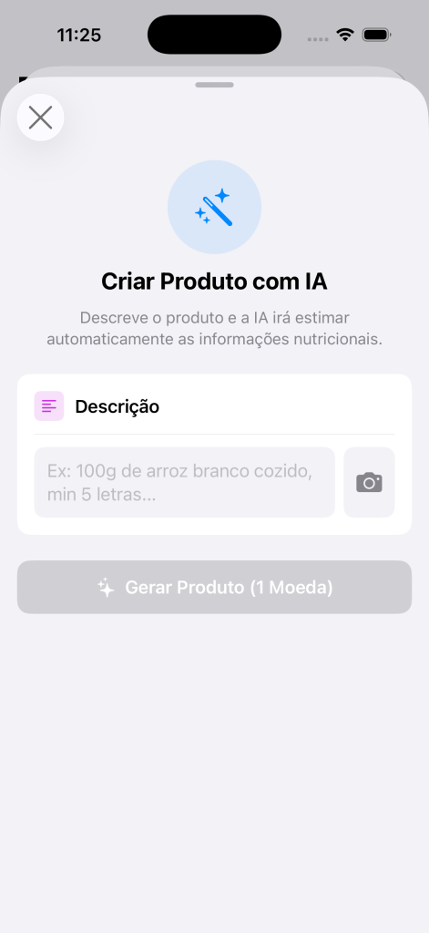 - A criação de produtos por IA pode consumir moedas, caso não seja subscritor Nutriora Pro