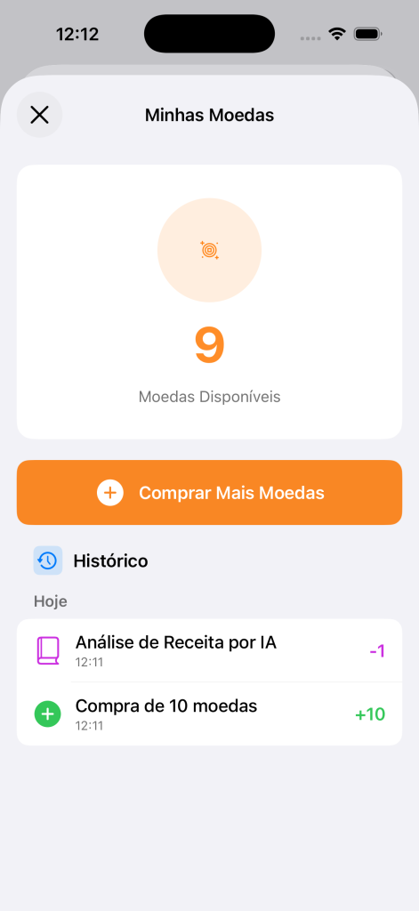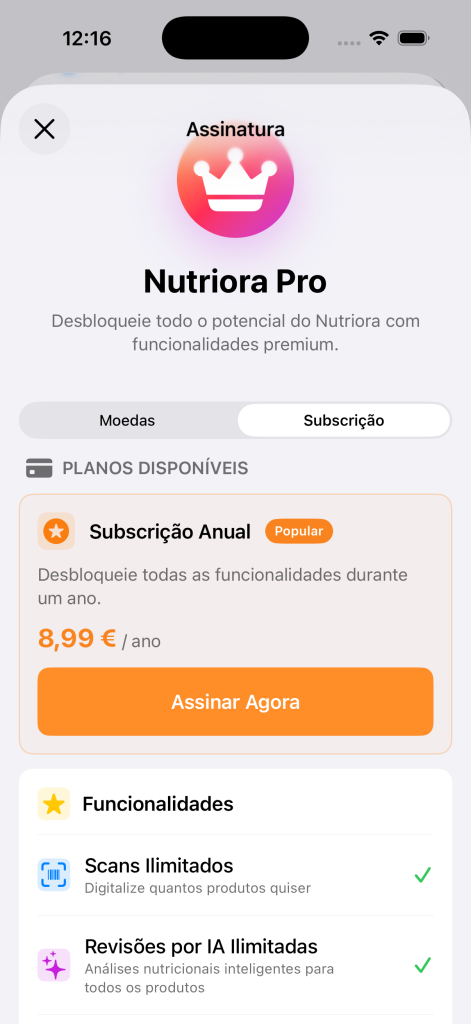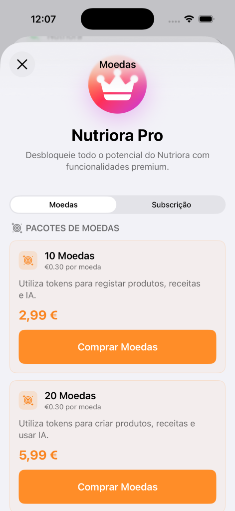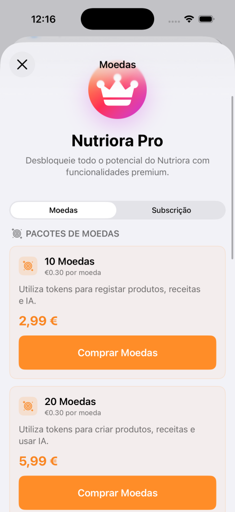 Sistema de Moedas do Nutriora permite aceder a funcionalidades avançadas de Inteligência Artificial e expandir limites da app de forma flexível, sem necessidade de subscrição.
